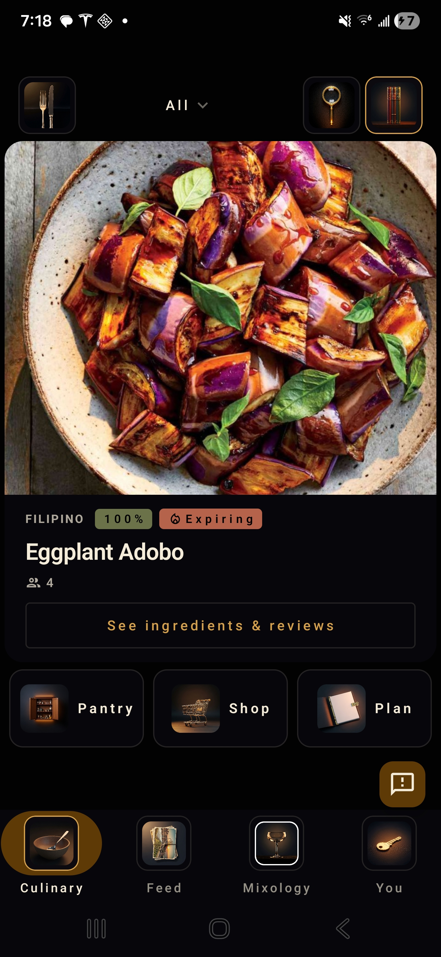 Works offline once a recipe is on screen. Saved recipes cache locally. The fridge scan and the link import are the only things that need a network connection.