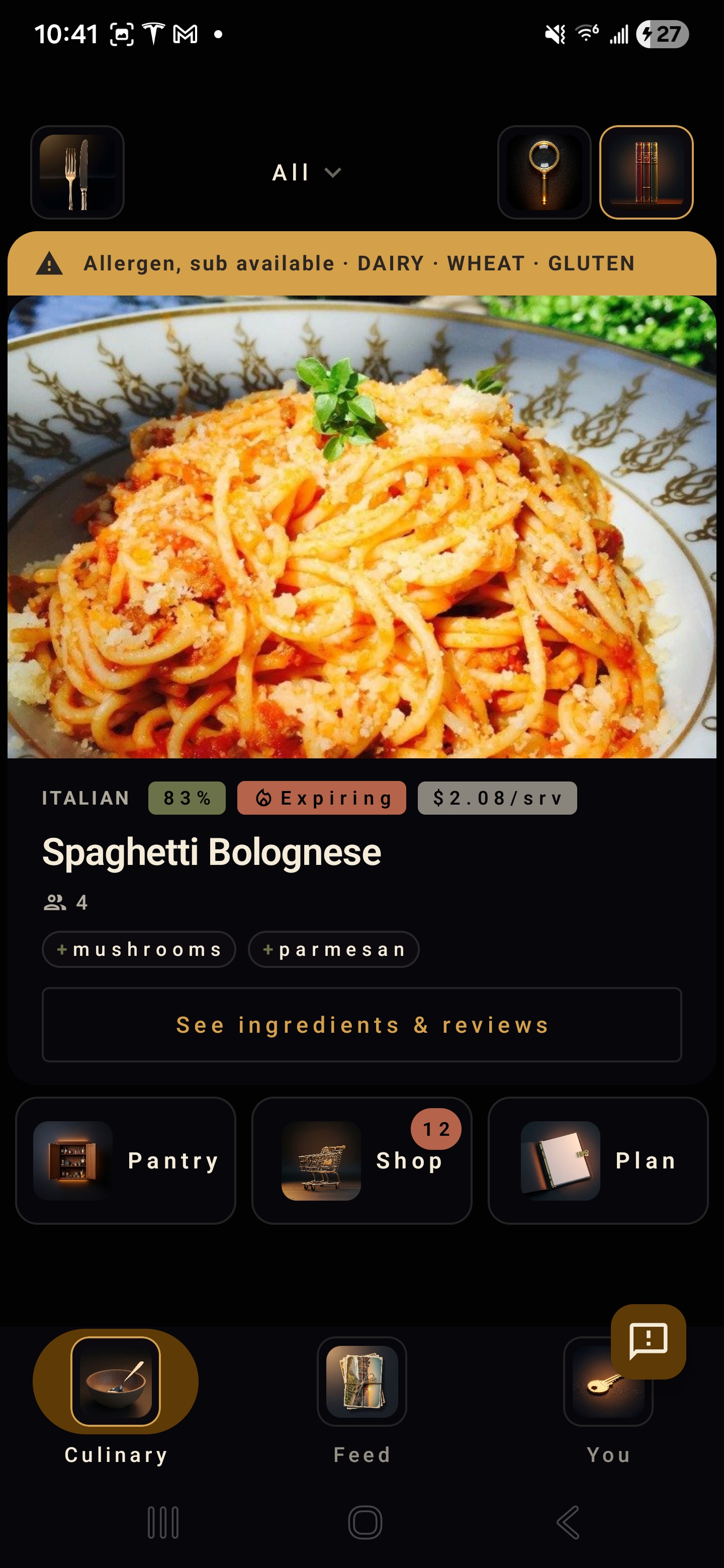 | Recipe matchers don't know what's actually in your fridge. | Fridge-photo scanComputer vision identifies what's in front of the camera and ranks tonight's recipes against it. |